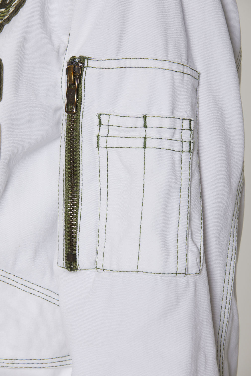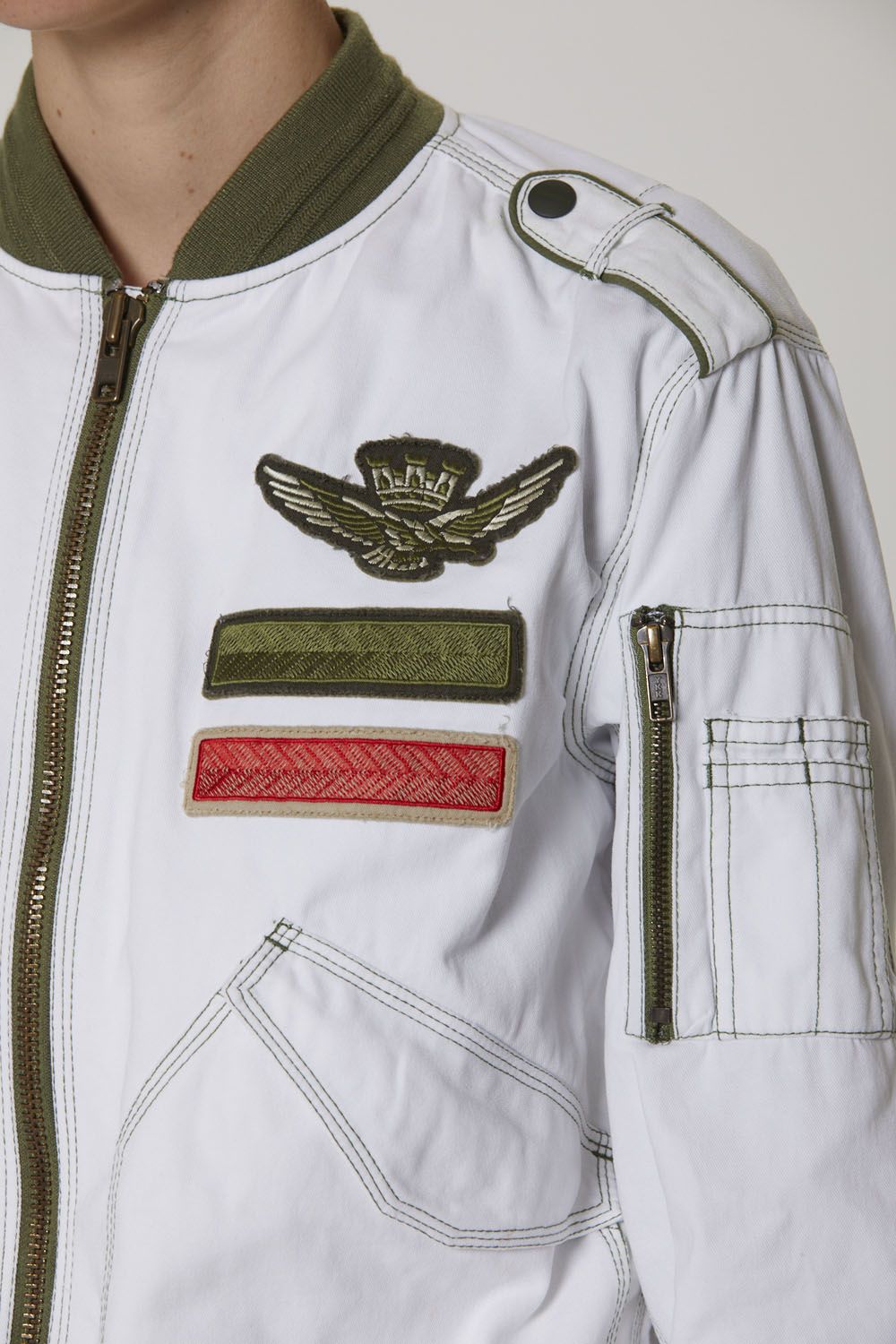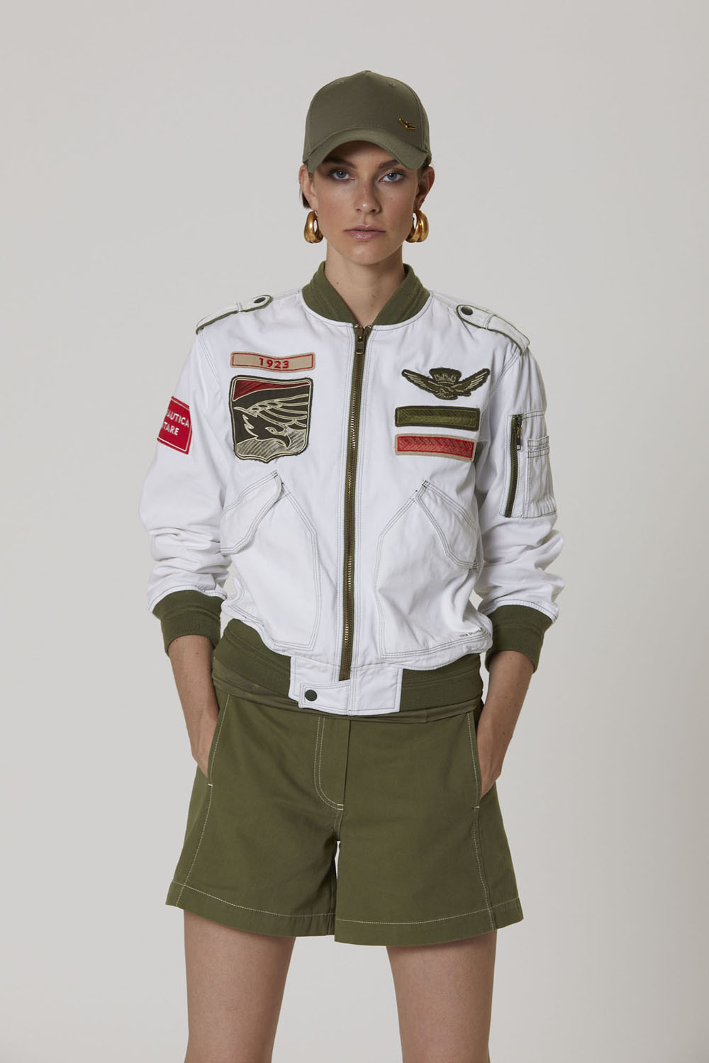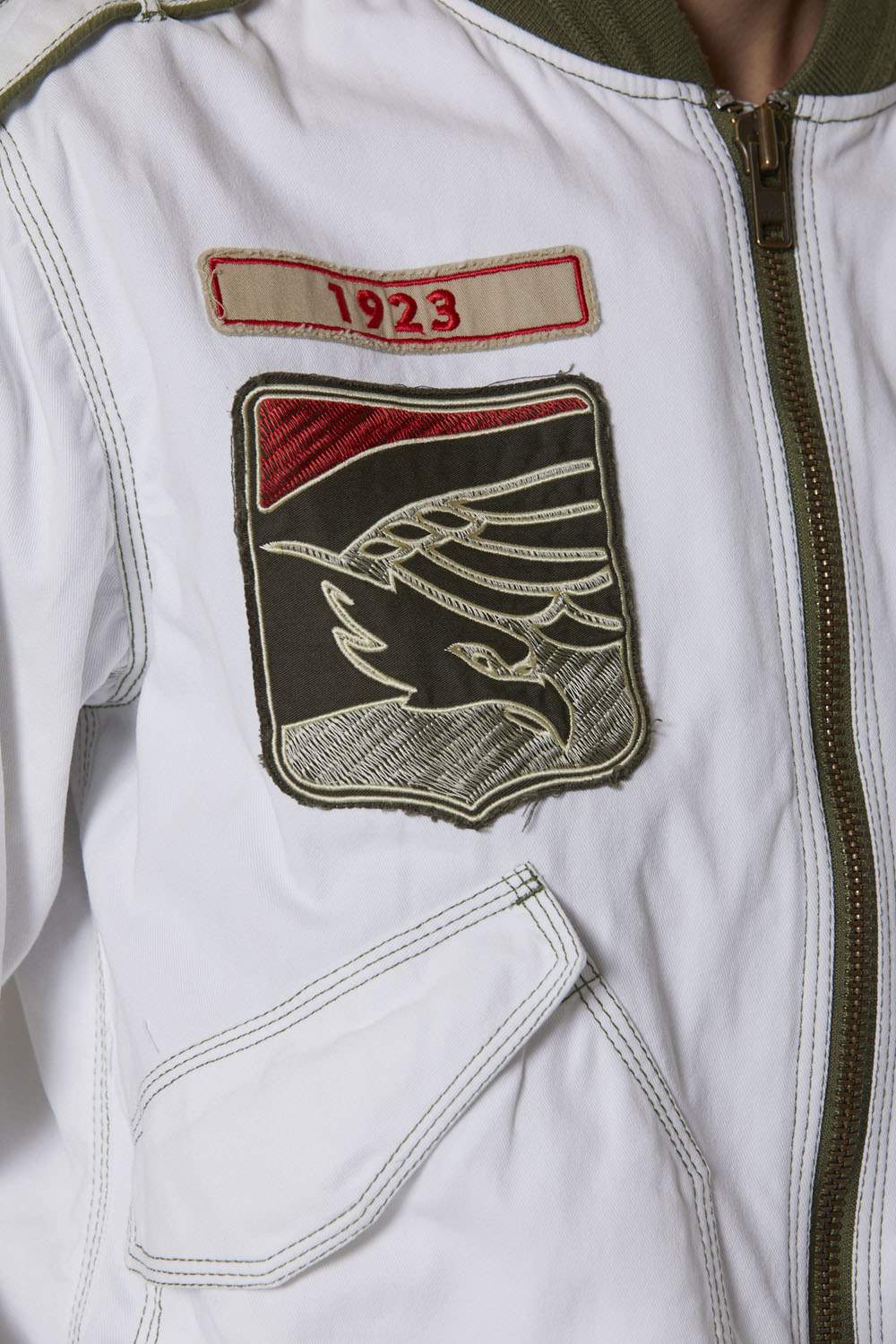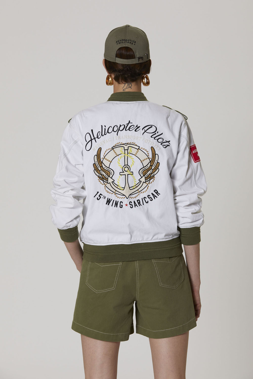 Tato bavlněná gabardénová bunda je ideální pro silnou ženu, která chce vyniknout. Zdobený několika nášivkami souvisejícími se světem letectví a na zadní straně obsahuje působivou grafiku na počest 15. perutě, jejímž hlavním posláním je záchrana posádek v nouzi. Jednotka se věnuje i neziskové činnosti, například pomáhá při pátrání po pohřešovaných na moři nebo v horách nebo při přepravě těžce zraněných osob.
