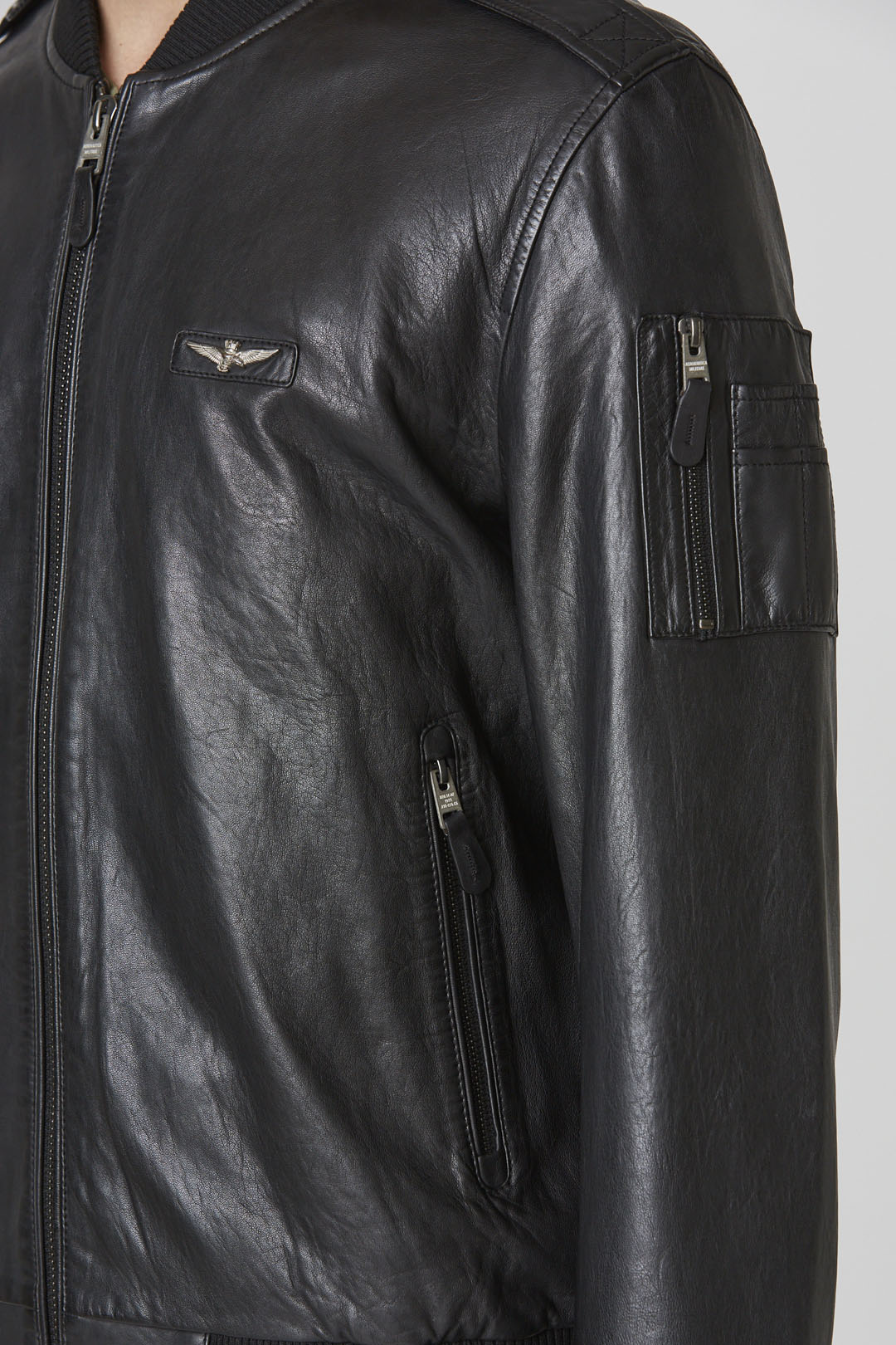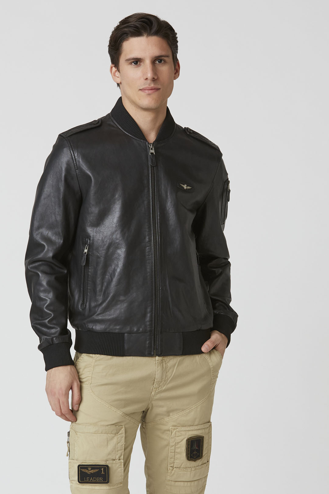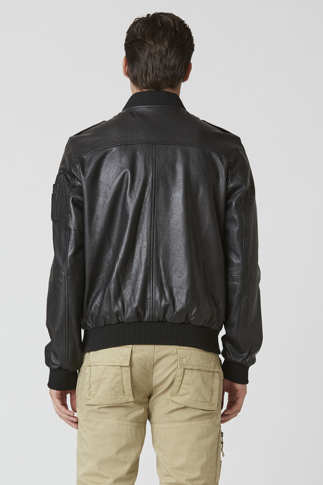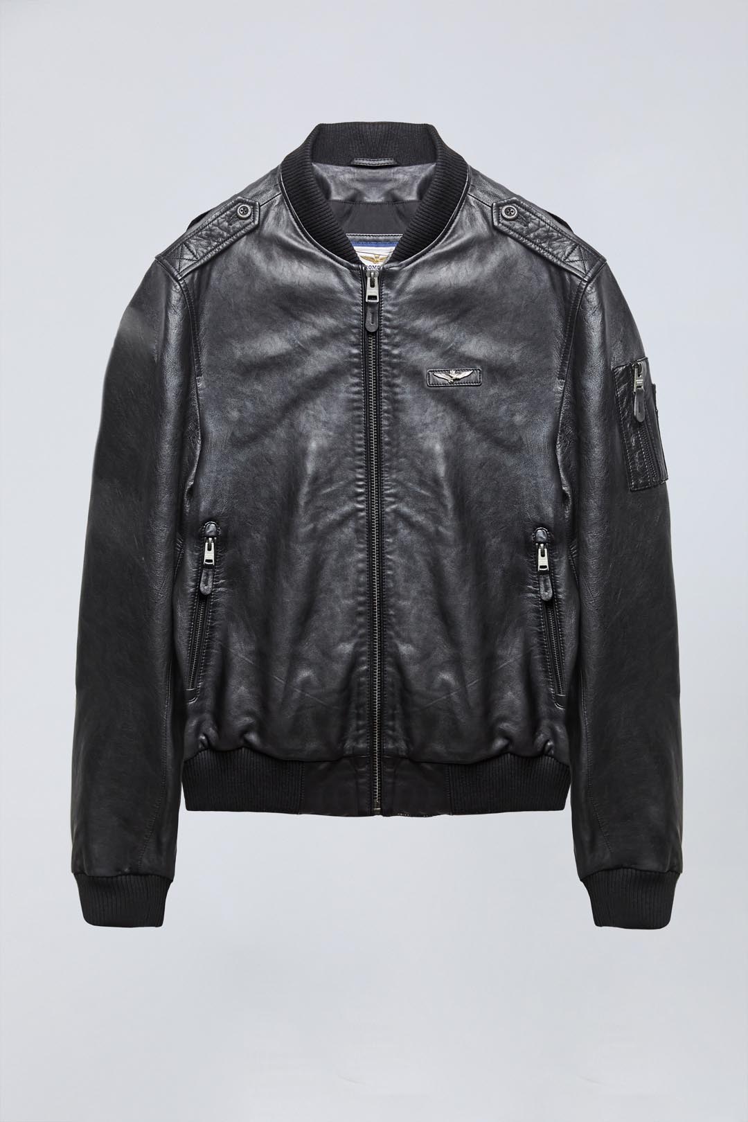 Tato pánská kožená bunda typu bomber, dostupná v černé barvě, prochází speciální úpravou, která zvýrazňuje barvu a dodává jí dynamické odstíny a vintage vzhled. Žebrovaný límec ve stylu bomber a žebrované manžety zajišťují optimální padnutí, zatímco vojensky inspirované detaily, jako je kapsa na rukávu a ramenní nárameníky, dodávají charakter. Kovová orlice na hrudi doplňuje vzhled s výrazným nádechem.
