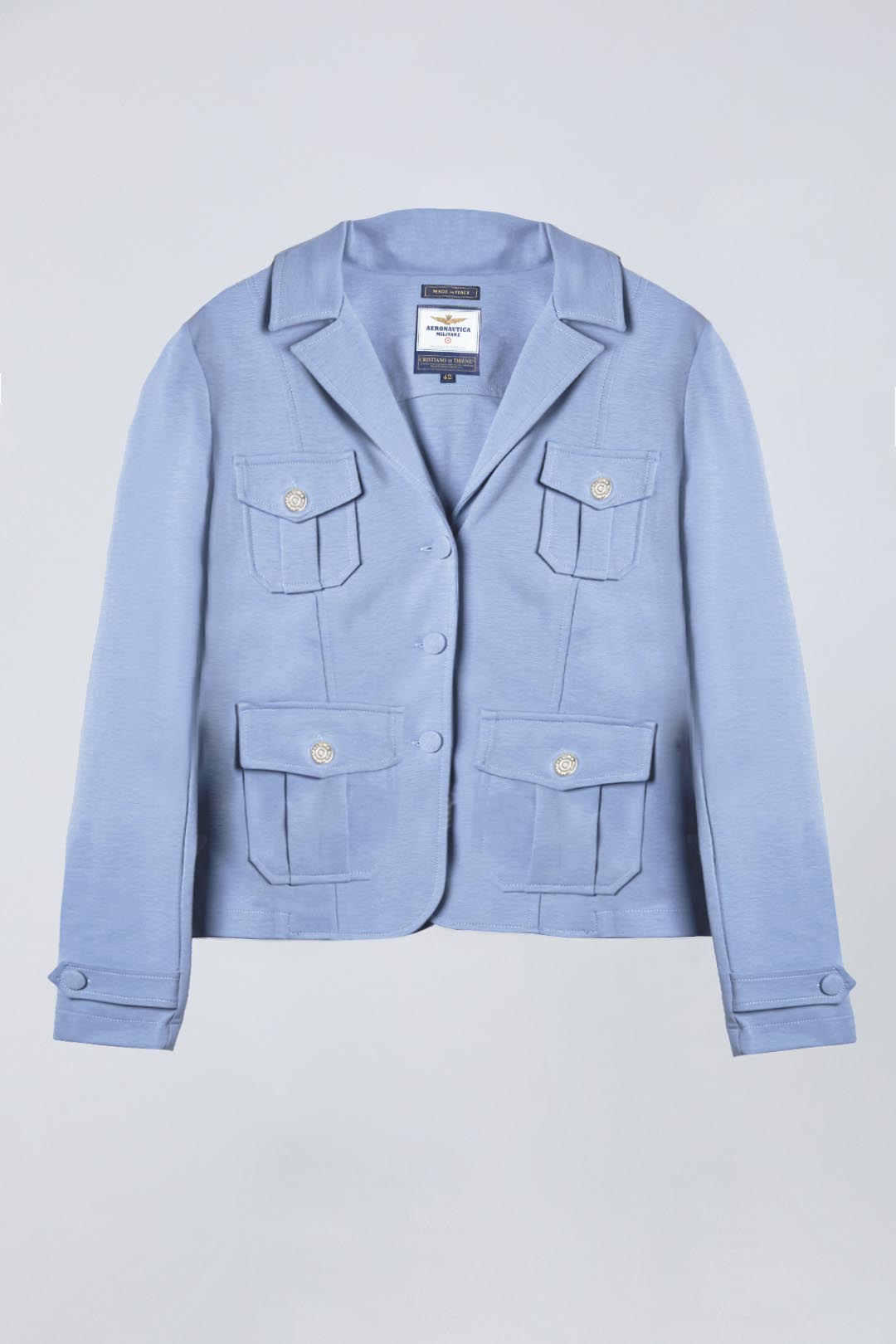 Elegance a praktičnost se snoubí v tomto saku ve vojenském stylu z elastické tkaniny Milano stitch, která je k dispozici v rafinovaných odstínech bílé a cukrově modré. Má vypasovaný střih a výrazné detaily, jako jsou nárameníky na ramenou a kapsy s klopou, a je určena pro ženy, které mají rády odvážný, moderní styl.