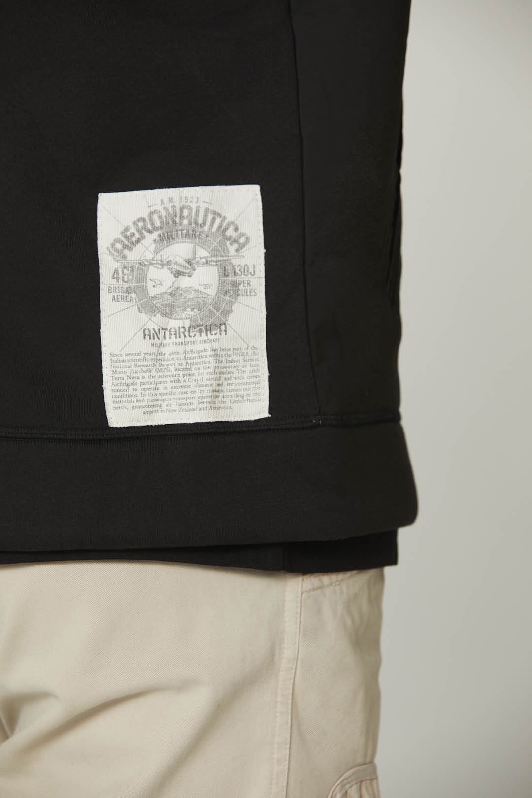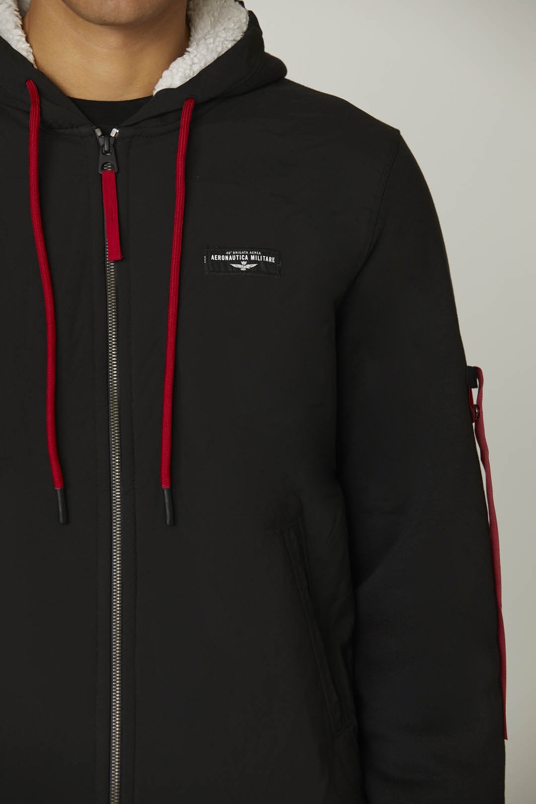 Zadní strana, rukávy, kapuce: 77 % polyester - 23 % bavlna.