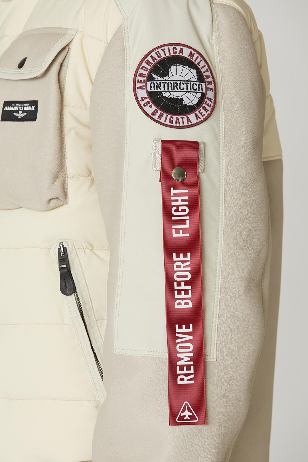 - Odnímatelná stuha "Remove before flight" a reflexní nášivka Antarctica na levém rukávu