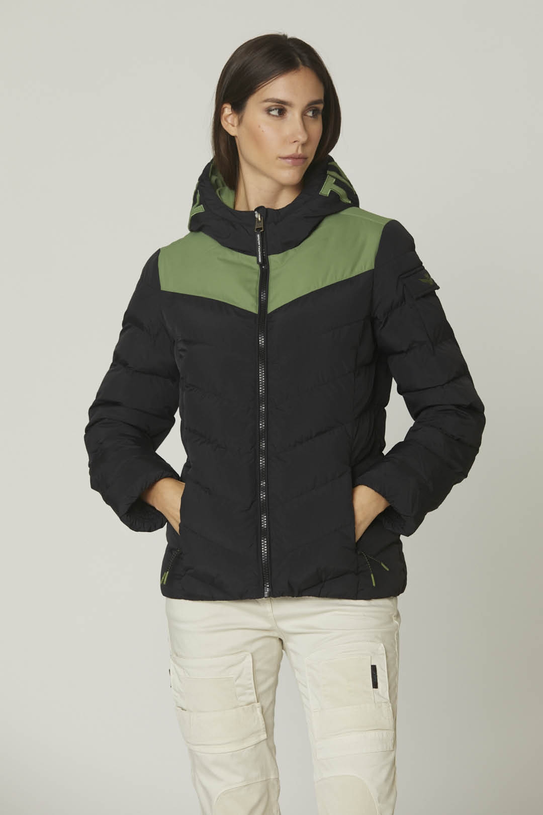 Tato všestranná dvoubarevná bunda je vyrobena v kombinaci výrazných a zářivých barev z vodoodpudivého polstrovaného nylonu. Design dokonale obepíná siluetu a obsahuje kapuci, přizpůsobenou podšívku, praktické zapínání na zip a praktické kapsy. Ležérní kousek, který vás zahřeje po celou sezónu.