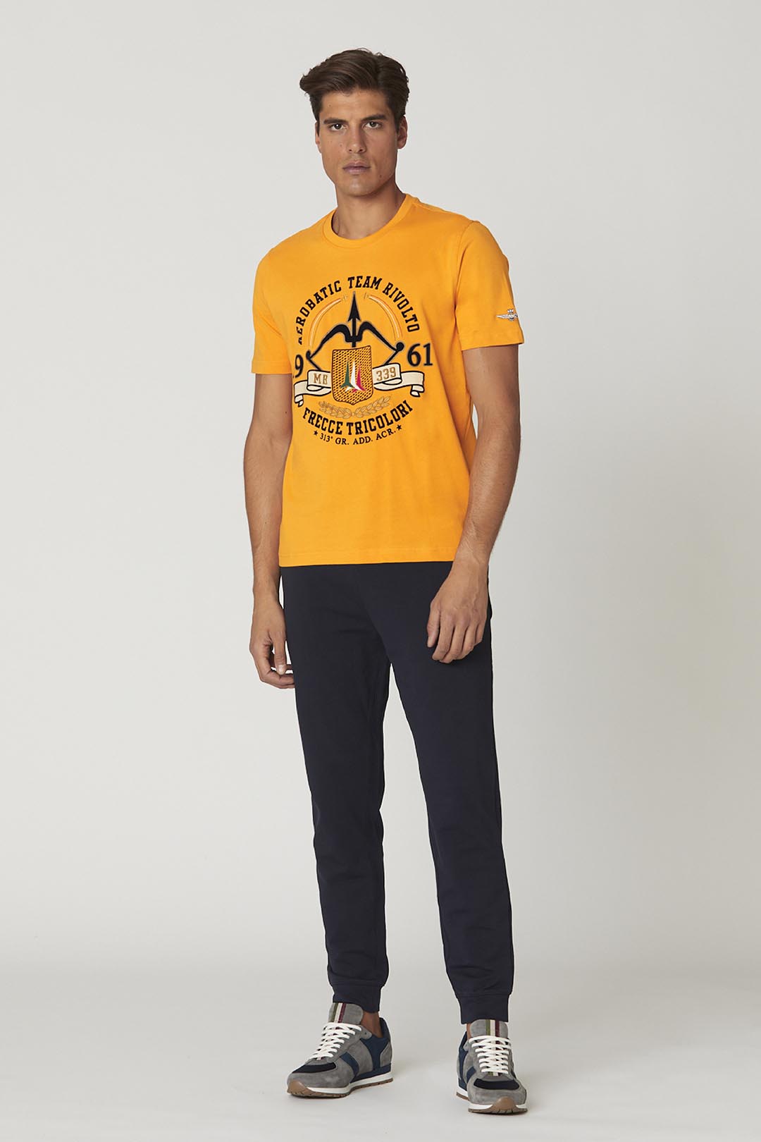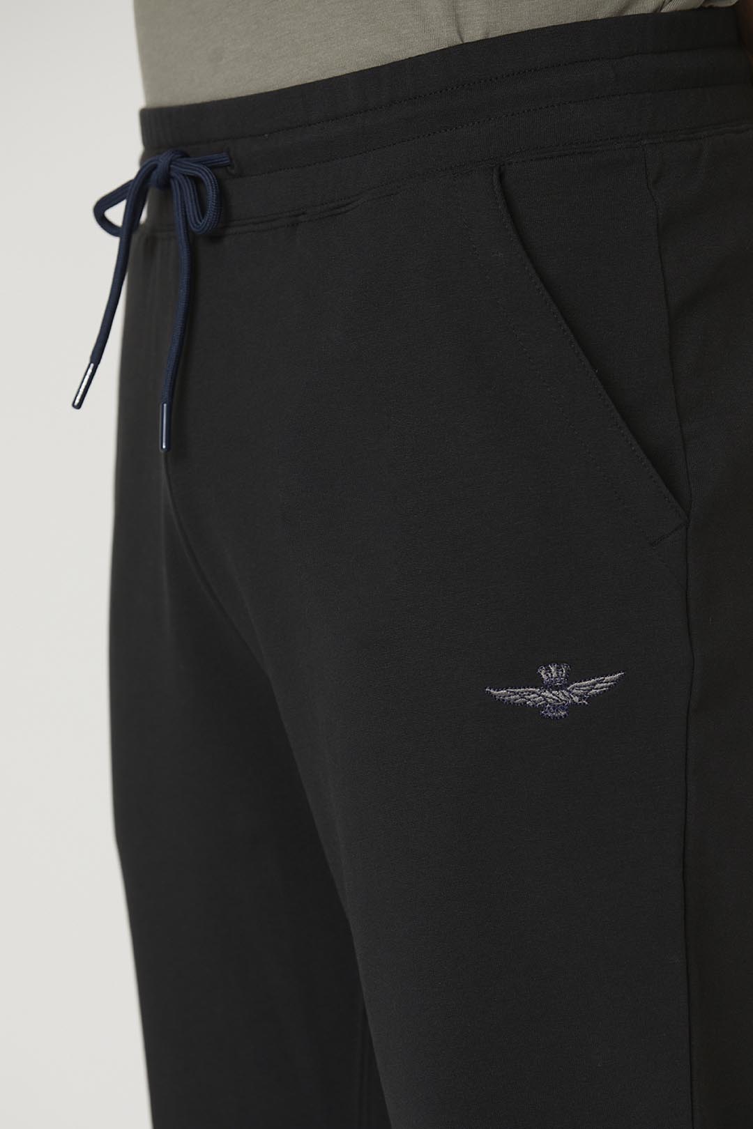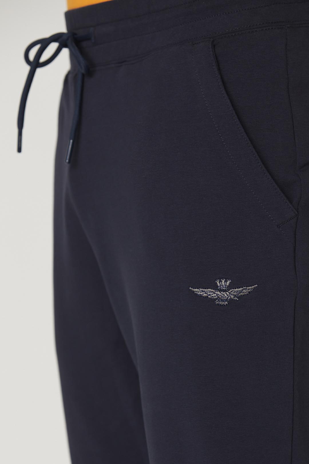- Podpisový korunovaný orel vyšitý tón v tónu na levé nohavici