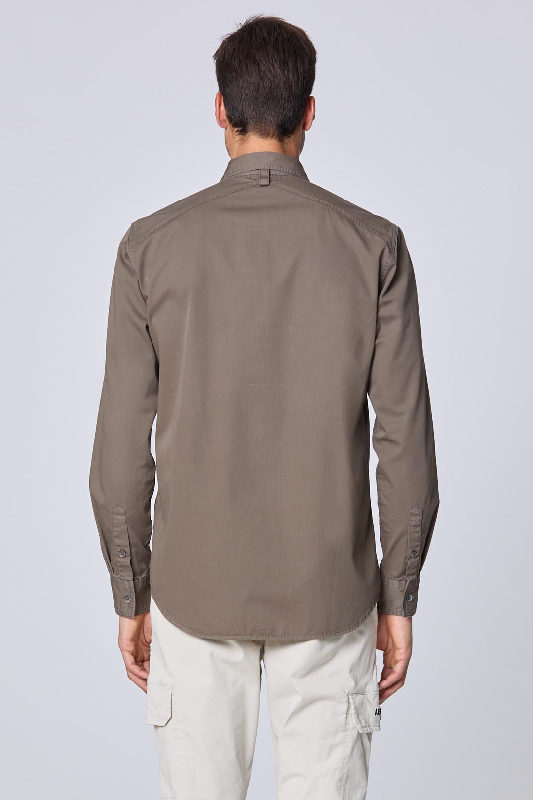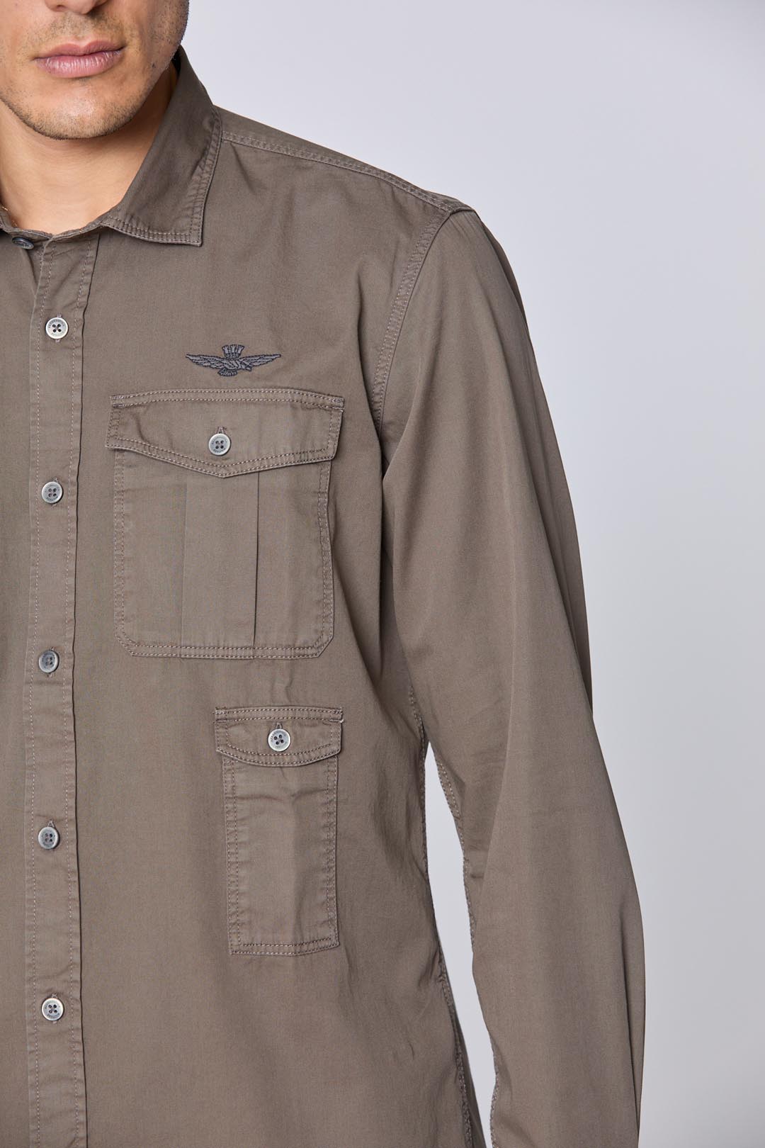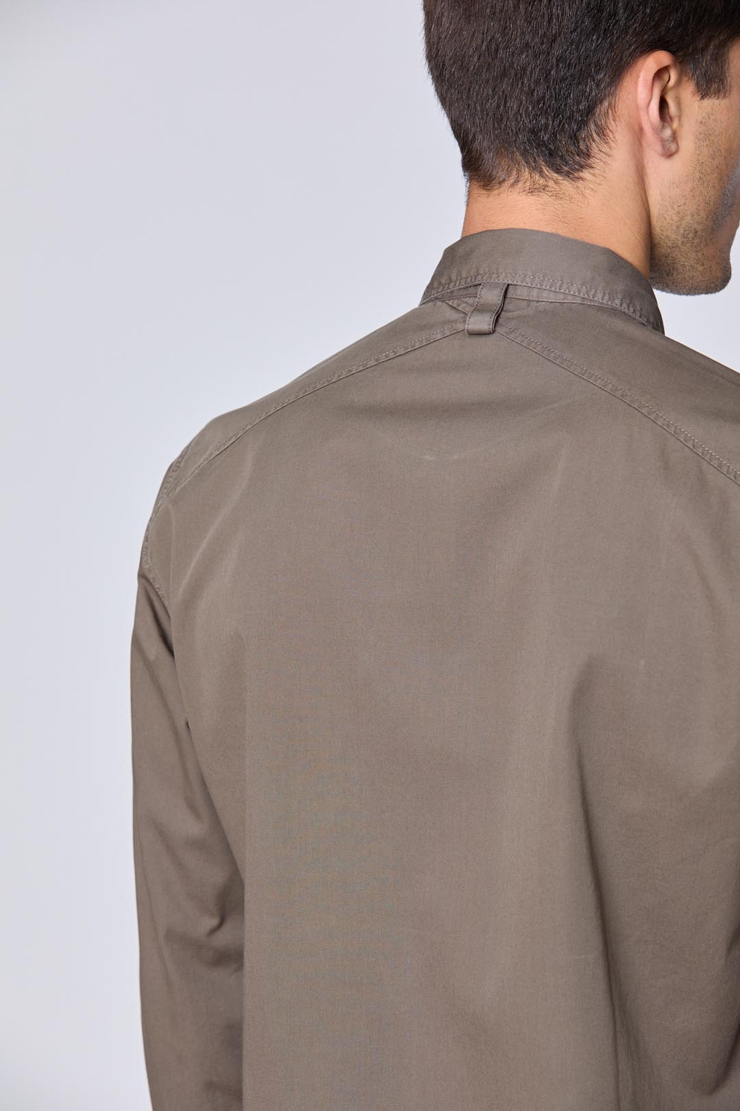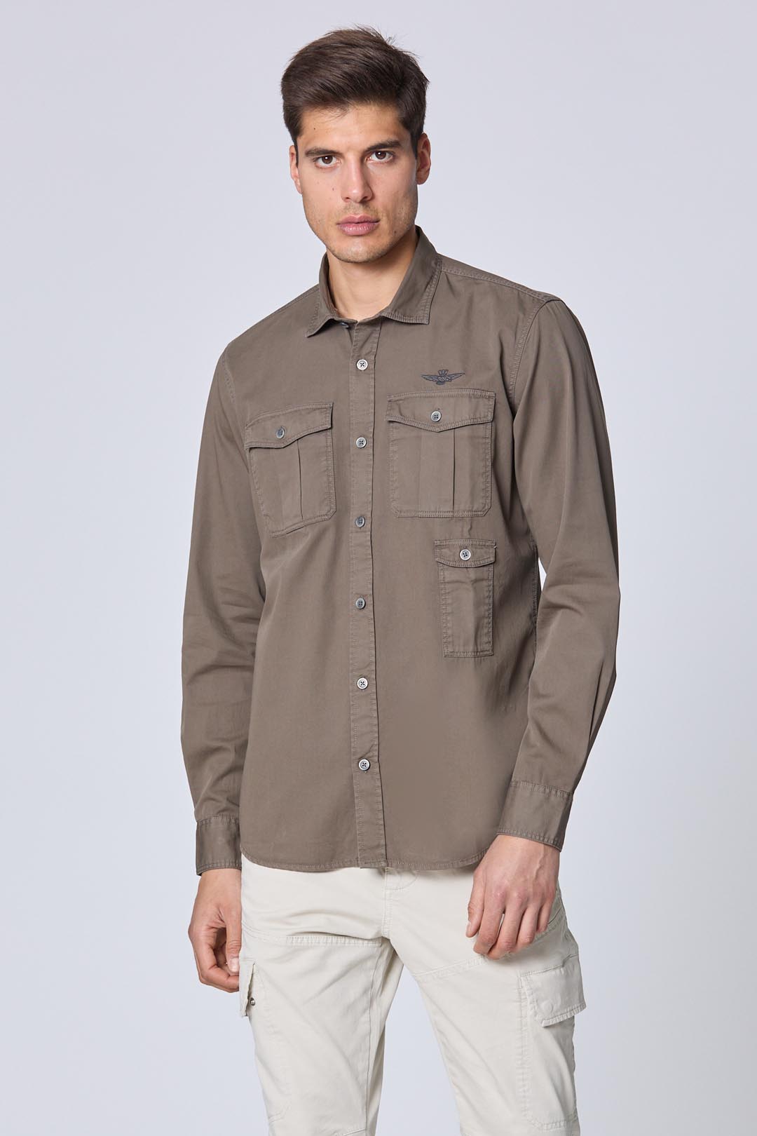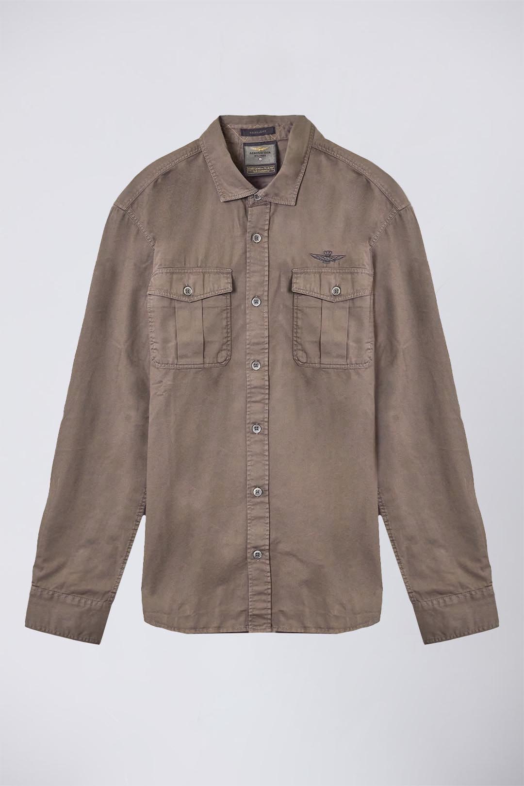 Vojenská a ležérní košile s dlouhým rukávem z bavlněného gabardénu, svěžího materiálu ideálního pro každé roční období. Košile se dvěma náprsními kapsami a malou kapsičkou s odvážným charakterem reinterpretuje pojem současné elegance.