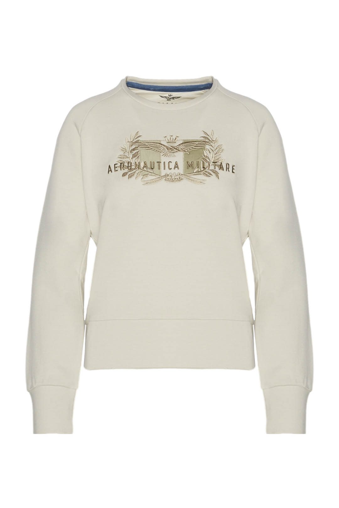 Měkká a hřejivá mikina s výstřihem z elastické gázové viskózy zdobená jemnou tónovou výšivkou, která zobrazuje charakteristické symboly letectva: italskou vlajku obklopenou vavříny a nad ní se tyčí ikonický orel s věží.