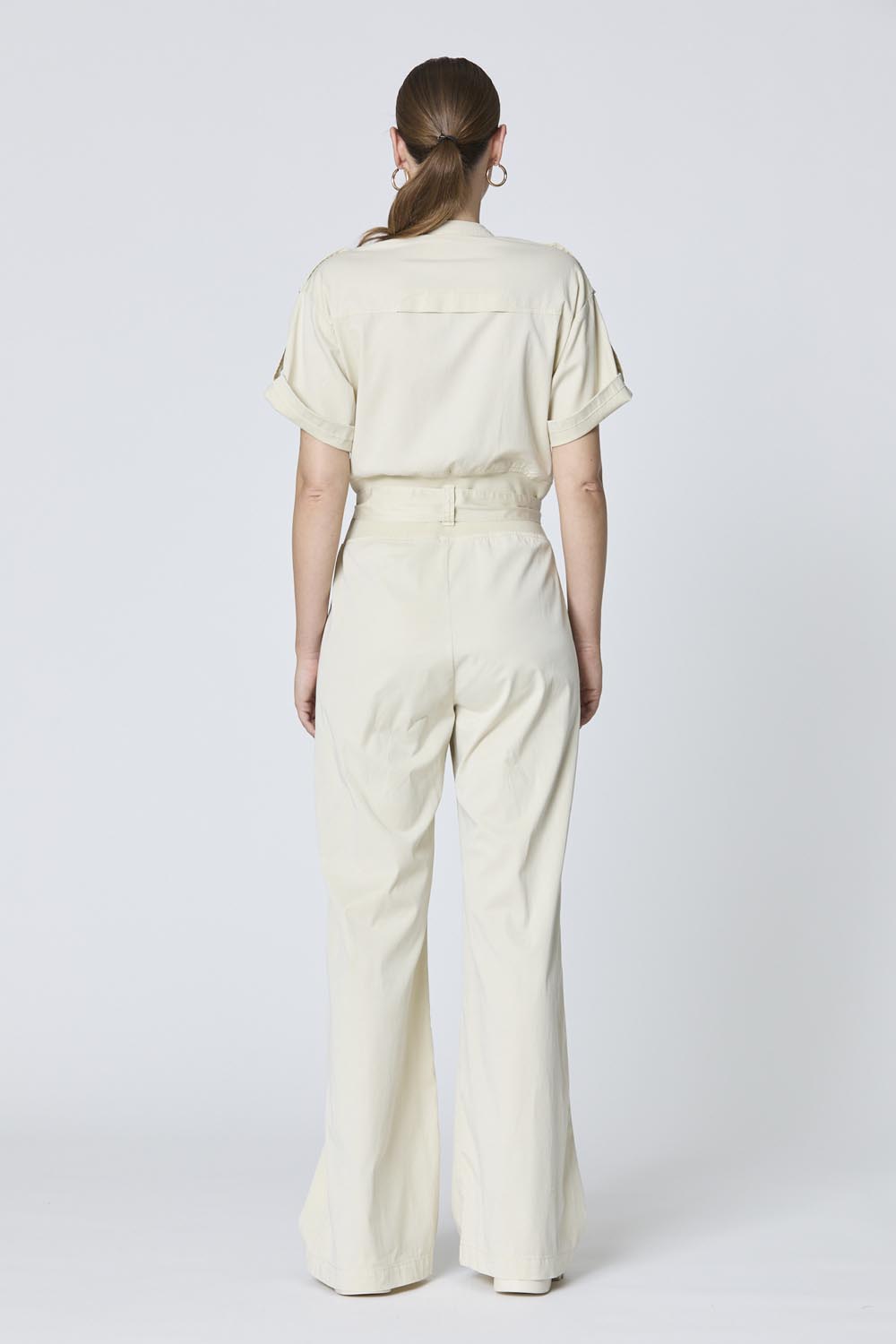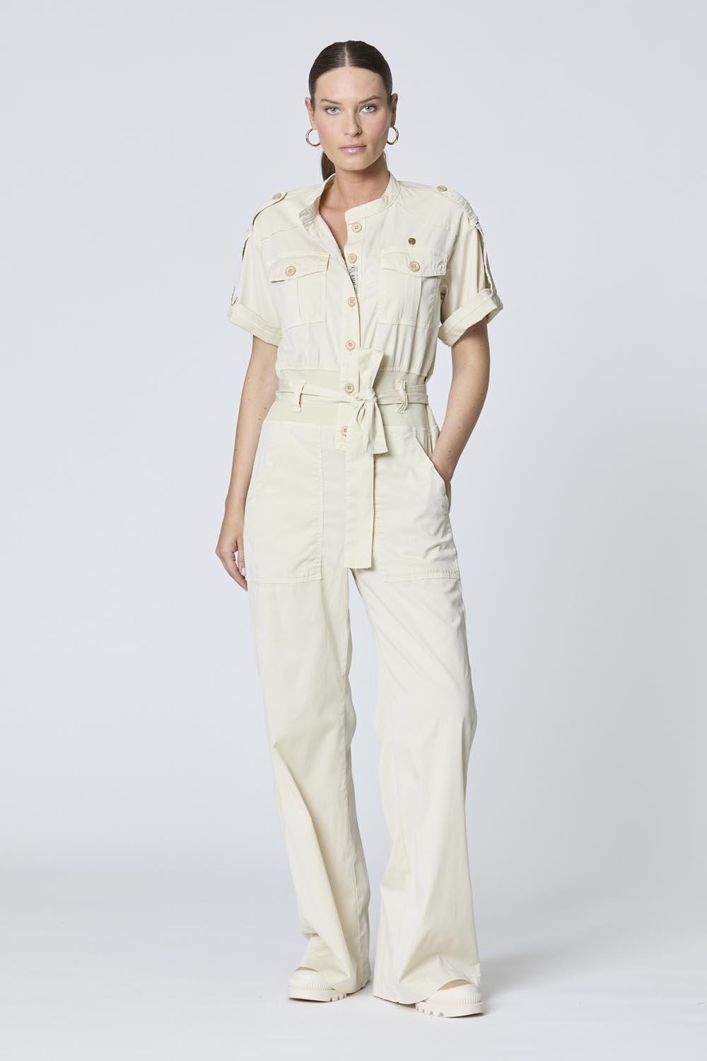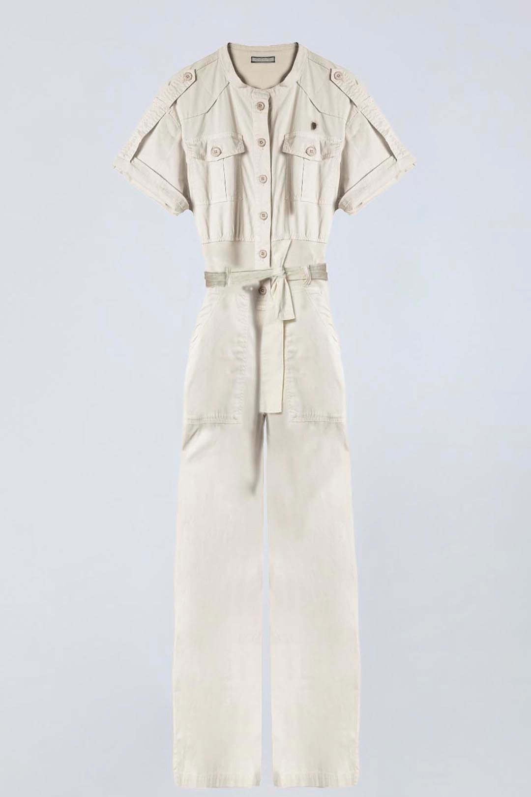 Tento elegantní overal má nastavitelné krátké rukávy a široké palazzo kalhoty, které mu dodávají dramatický a sofistikovaný vzhled. Luxusní směs tencelu a bavlny obepíná tělo žebrovaným pasem, který lze stáhnout pomocí pásku. Detaily inspirované armádou, jako je erb s logem a boční kapsy, doplňují tento moderní a výrazný kousek.