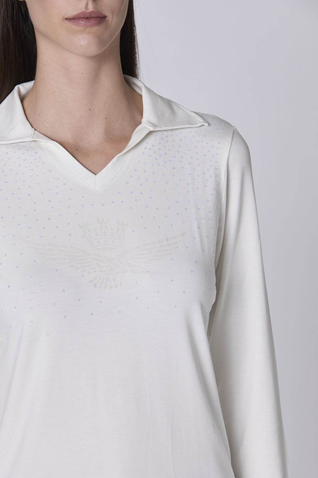 Tato výrazná dámská polokošile s dlouhým rukávem je vyrobena z mimořádně měkké strečové tkaniny, která zajišťuje přiléhavý a pohodlný střih, jenž elegantně obepíná tělo. Design je navíc obohacen potiskem ikonického znaku orla, symbolu síly a prestiže, obohaceného kaskádou třpytivých kamínků, které jemně spadají z ramen. Tento oděv nejenže dodá každému outfitu šmrnc, ale také upoutá pozornost svými rafinovanými detaily.