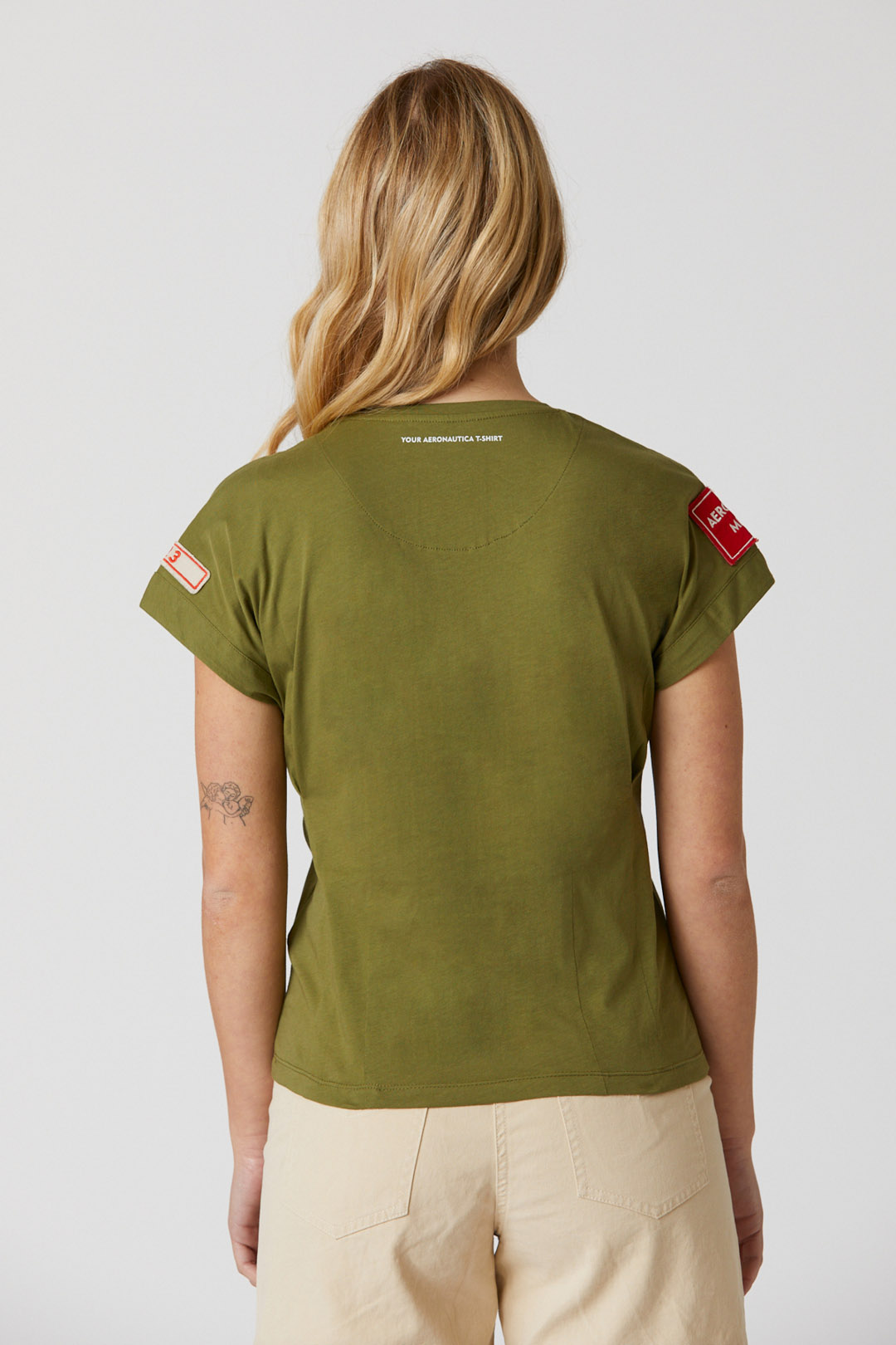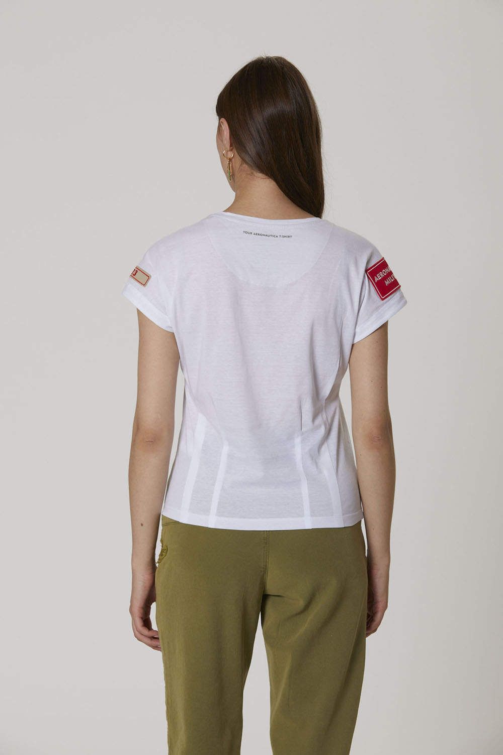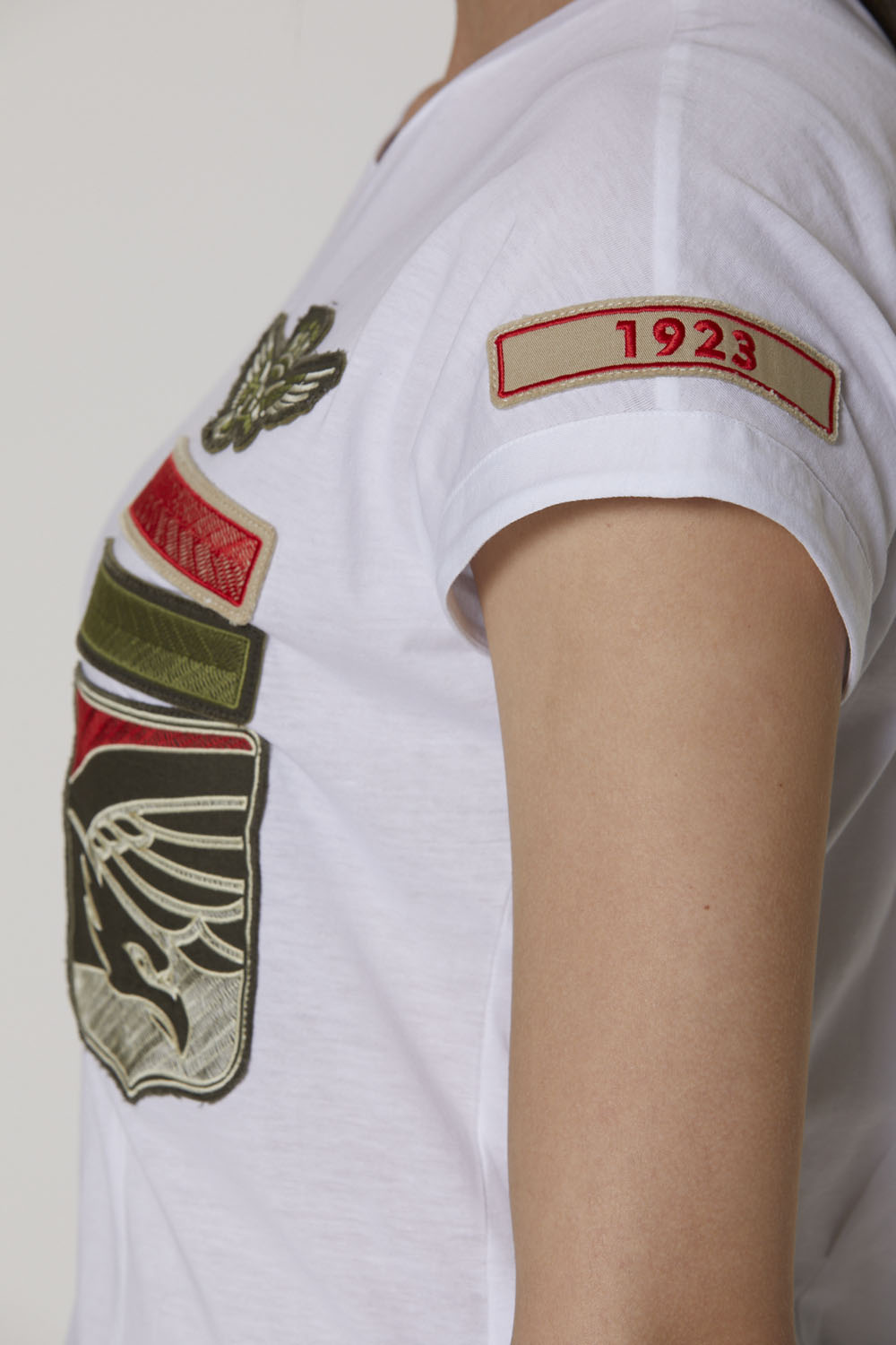 Oděv, který plně reprezentuje silnou ženu Aeronautica Militare. Tričko ze strečového bavlněného žerzeje charakterizované speciálními kimonovými rukávy a sadou nášivek věnovaných světu letectví. Perfektní pro vytvoření odvážného vzhledu, který nezůstane bez povšimnutí.