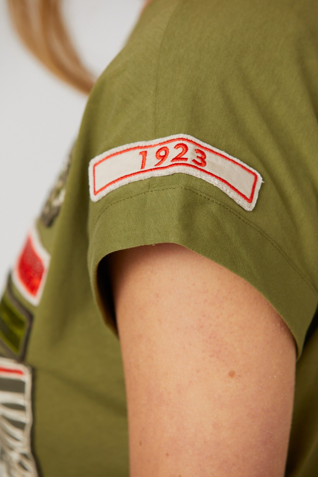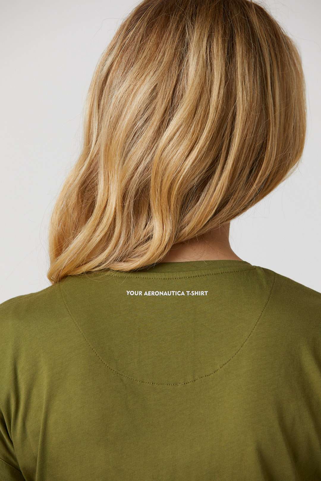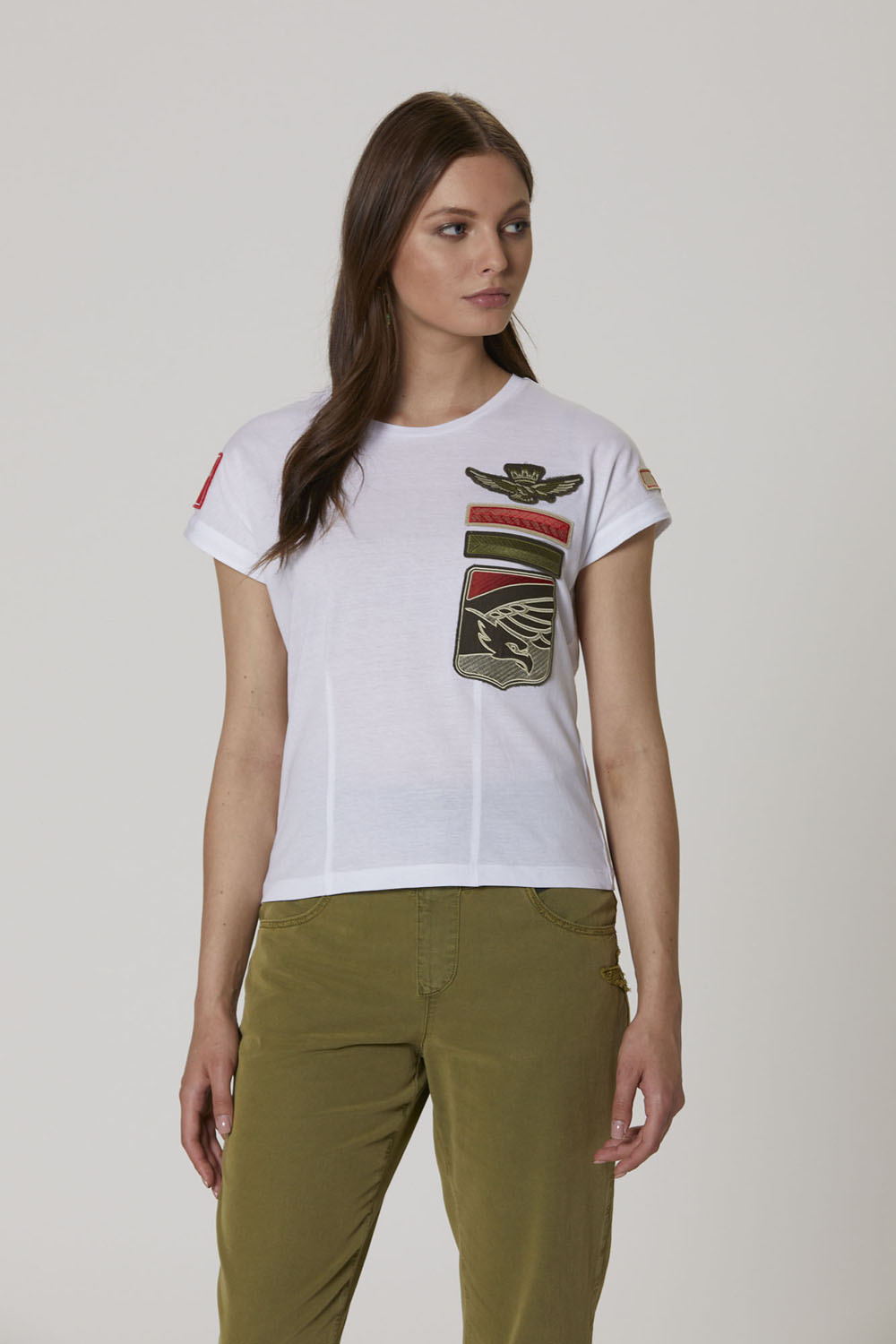 Oděv, který plně reprezentuje silnou ženu Aeronautica Militare. Tričko ze strečového bavlněného žerzeje charakterizované speciálními kimonovými rukávy a sadou nášivek věnovaných světu letectví. Perfektní pro vytvoření odvážného vzhledu, který nezůstane bez povšimnutí.