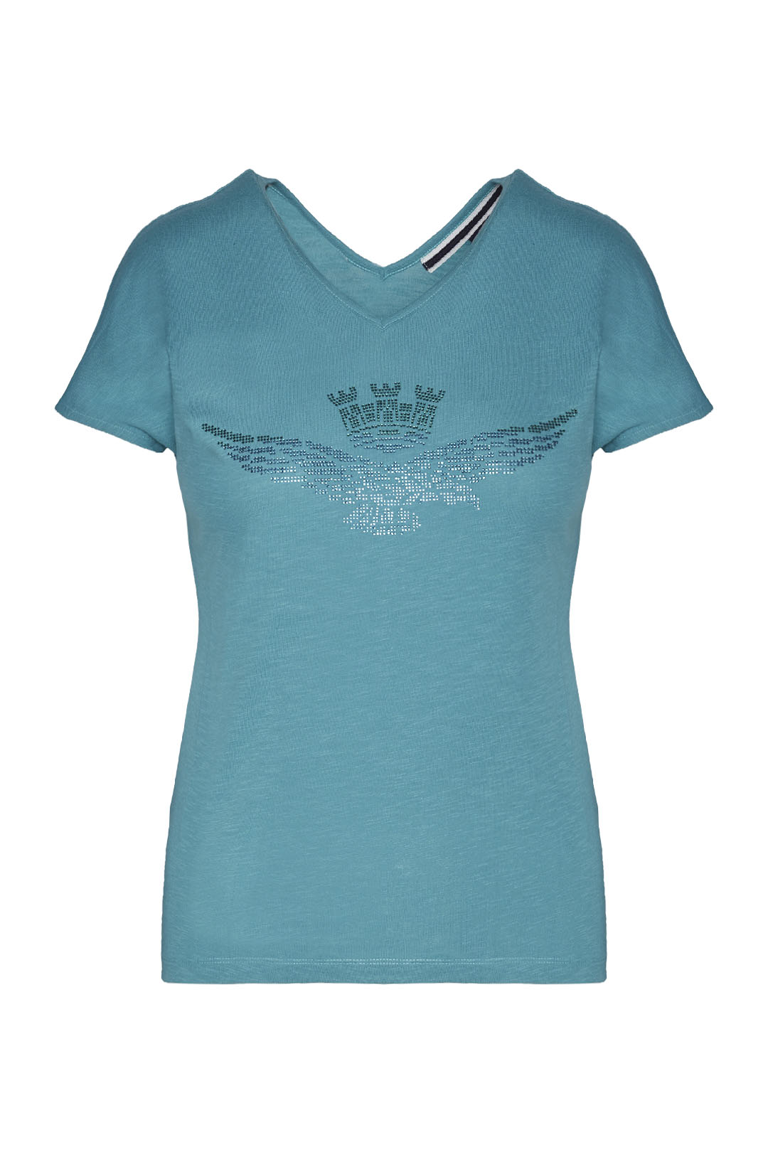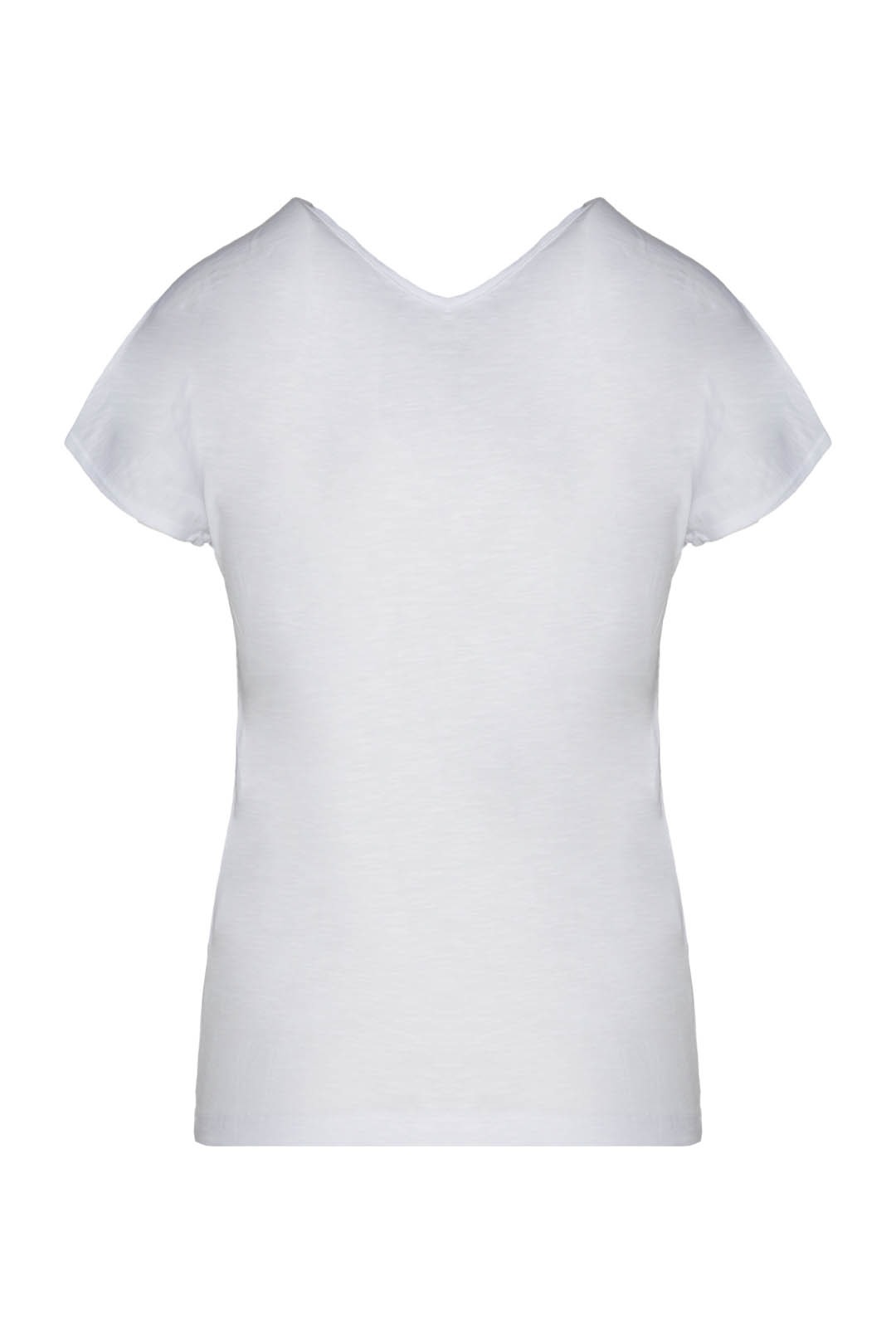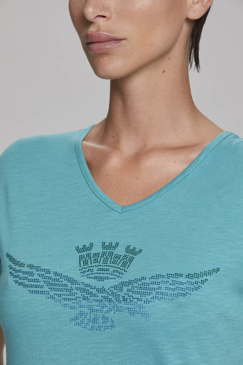 Tričko z bavlněného žerzeje s výstřihem do V vpředu i vzadu. Oděv s čistým designem, zdobený kamínky s degradovaným efektem, který dodává oděvu okouzlující nádech.