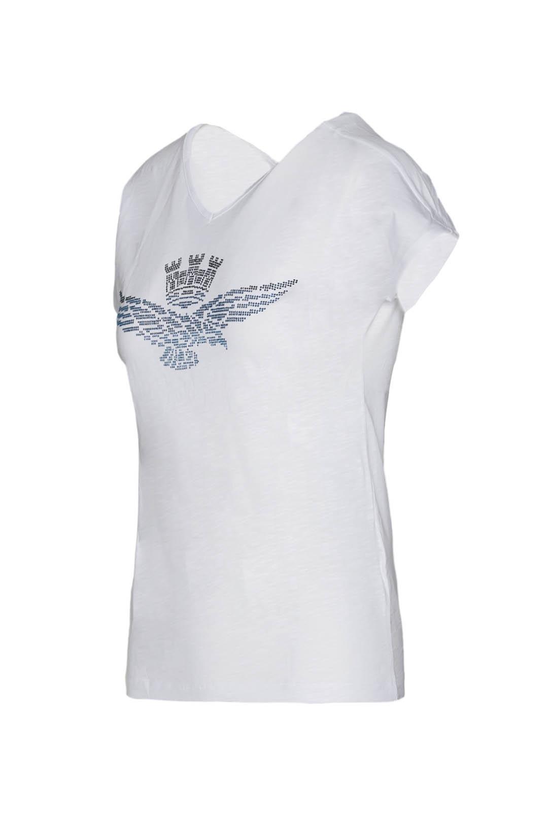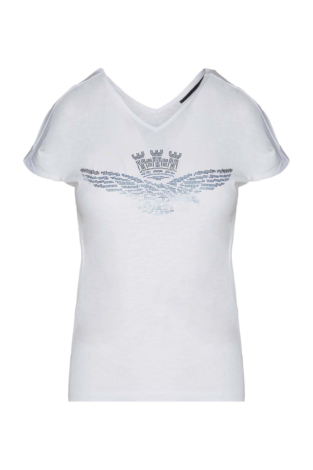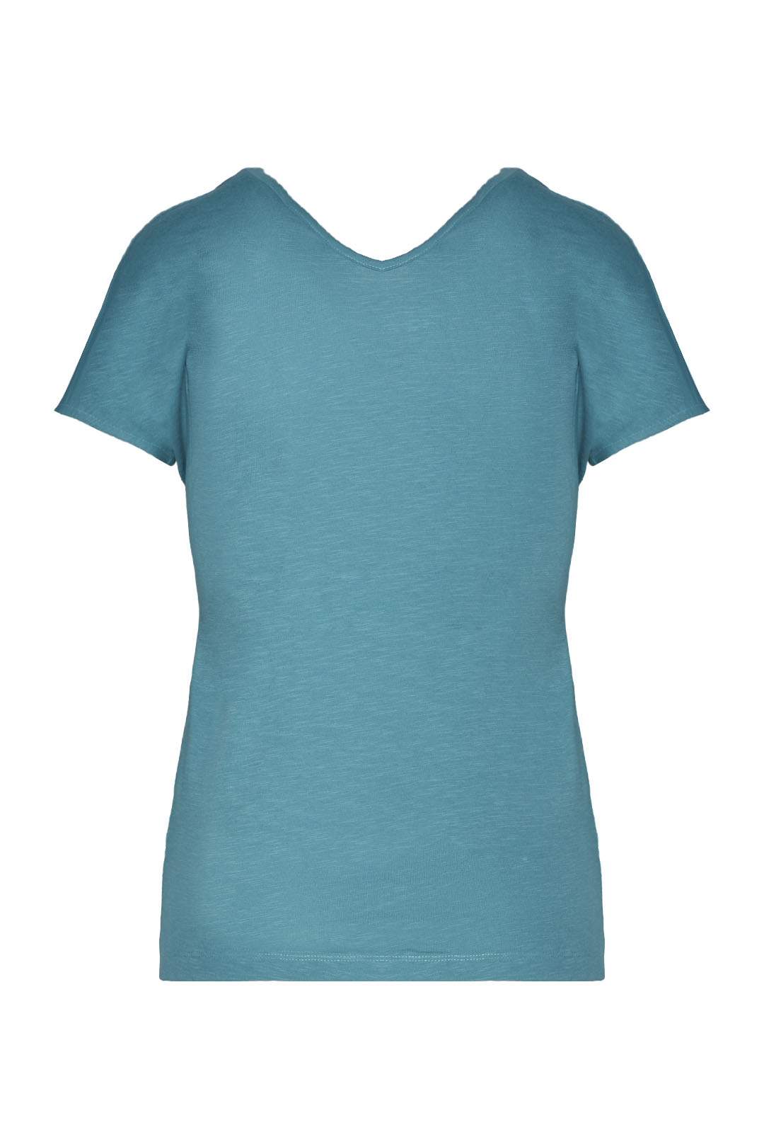 Tričko z bavlněného žerzeje s výstřihem do V vpředu i vzadu. Oděv s čistým designem, zdobený kamínky s degradovaným efektem, který dodává oděvu okouzlující nádech.